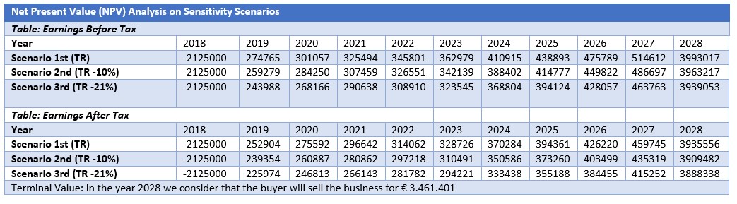 Subsequently, we have run a sensitivity analysis in order to examine the effect of two extreme scenarios on revenues and profitability under the new management disregarding the prospects of acquisition. As we can see the ideal version of our business has performed well even under the worst-case scenario.